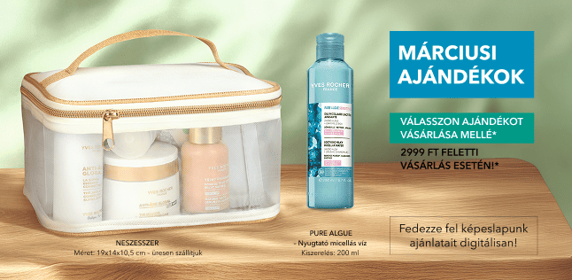 *Választható ajándék: neszesszer vagy 200 ml-es Pure Algue tejes micellás víz érzékeny bőrre 2999 Ft feletti szépségápolási termék vásárlása esetén adható vásárlónként egy alkalommal a készlet erejéig. Az ajánlat más kedvezményekkel nem összevonható.