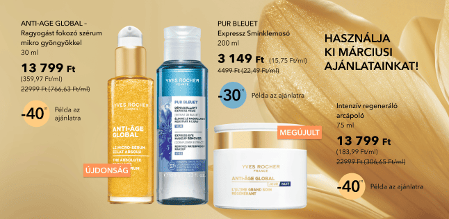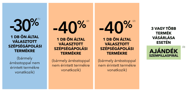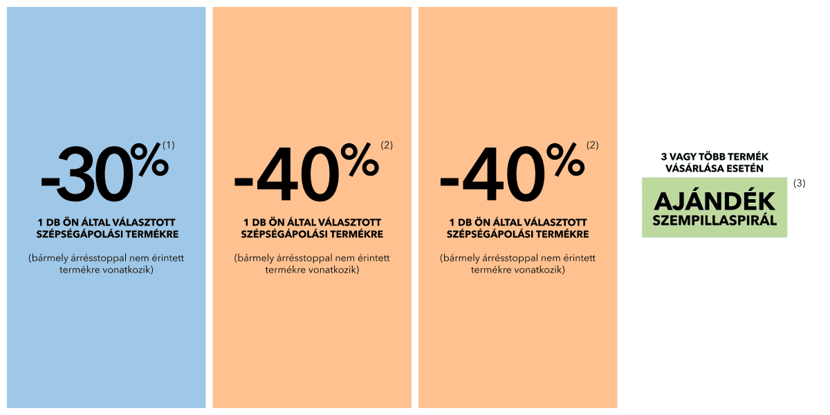 (2) 40% kedvezmény egy db Ön által választott szépségápolási termékre. Az ajánlat más kedvezményekkel nem összevonható. Nem vonatkozik az árrésstoppal jelölt termékekre, csomagokra, ajándékutalványokra.