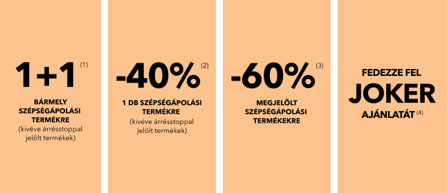 (3) ) 60% kedvezmény egy db Ön által választott szépségápolási termékre a megjelölt kínálatból. Az ajánlat a készlet erejéig tart és Márkaboltonként változó lehet a kínálat.